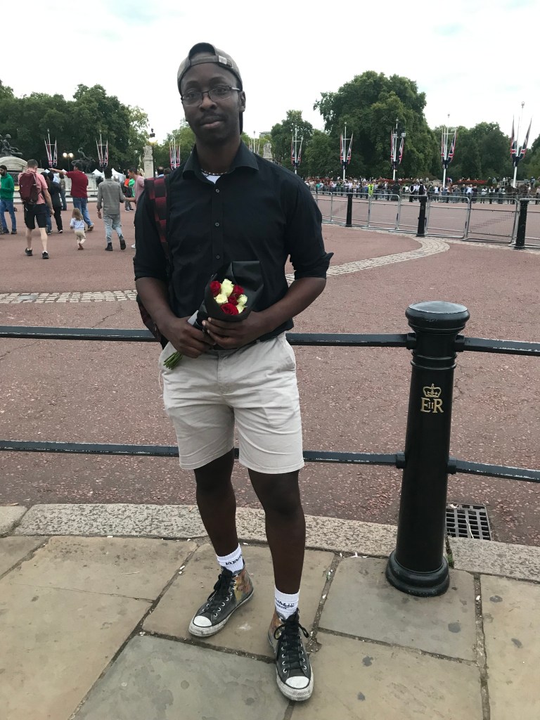 Marcus came to mourn the death of Queen Elizabeth II with a bouquet of flowers.