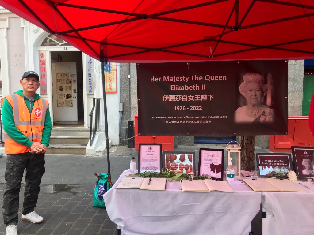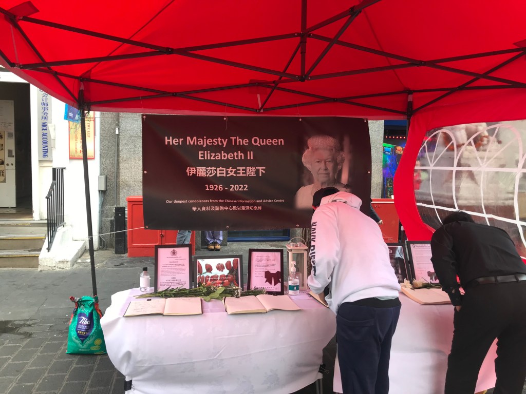 A stall has been set up in Gerrard Street, Chinatown, for people to pay their respect to the late Queen on the 9th of September. The mourning service is organised by an unofficial Chinese community the ‘Chinese Information and Advice Centre’ in London.