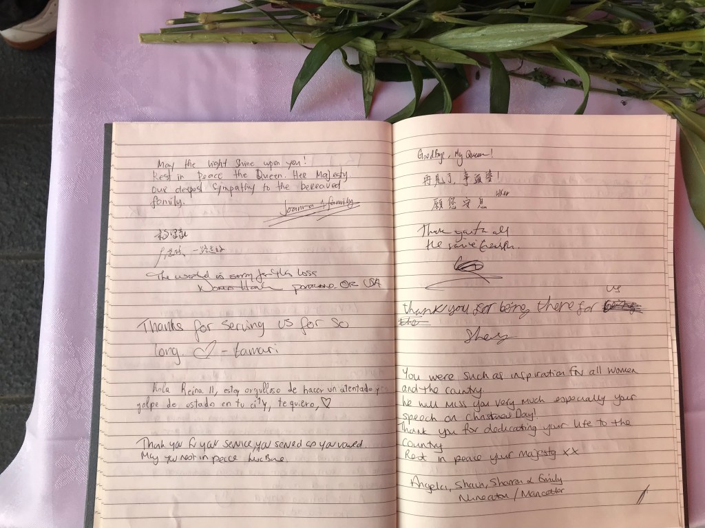 “So far, more than 1000 people have signed and written their personal messages for the Queen. Half of the signatures and messages are from UK-based Chinese, and the rest are from the British and people from other nationalities. We merely have any Chinese tourists signing for the condolence book because of the sensitive UK–China relations at the moment.”